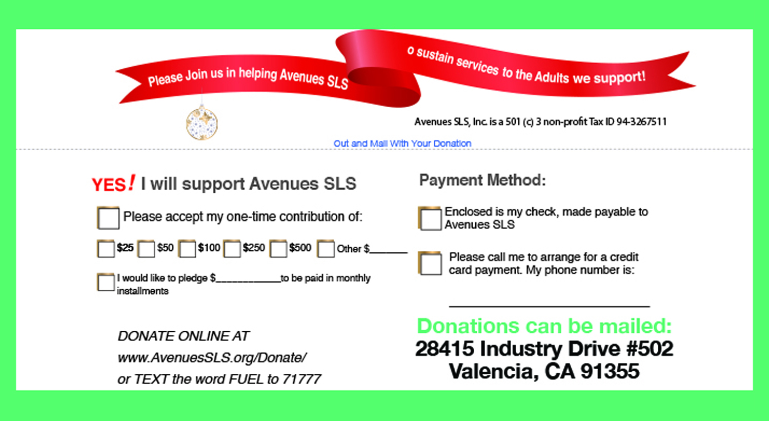 You can read more in-depth details on this campaign by texting the word “Fuel” to 71777 on your handheld device. There you can find a few examples of volunteer positions held by people we support such as; Steve distributing flowers at the SCV Convalescent Hospital; Ronda, retired from the Regional Center at age 80, volunteering at the Avenues SLS Office, Pam A.; giving of her time at Best Friends Animal Society; Christopher volunteering at the Salvation Army, Hart Park & Soles for Souls. In addition, Aaron E. donates to local Fire Departments, delivers flowers to receptionists at other non-profit agencies and delivers food to the homeless. Cheryl continues to work as an advocate and volunteer as a founding board member of Avenues SLS. Again, your support is important to Avenues SLS so that we can continue to provide quality service and further our mission. We want to show our community that we can and are making a difference! With great appreciation, we thank you for your support.