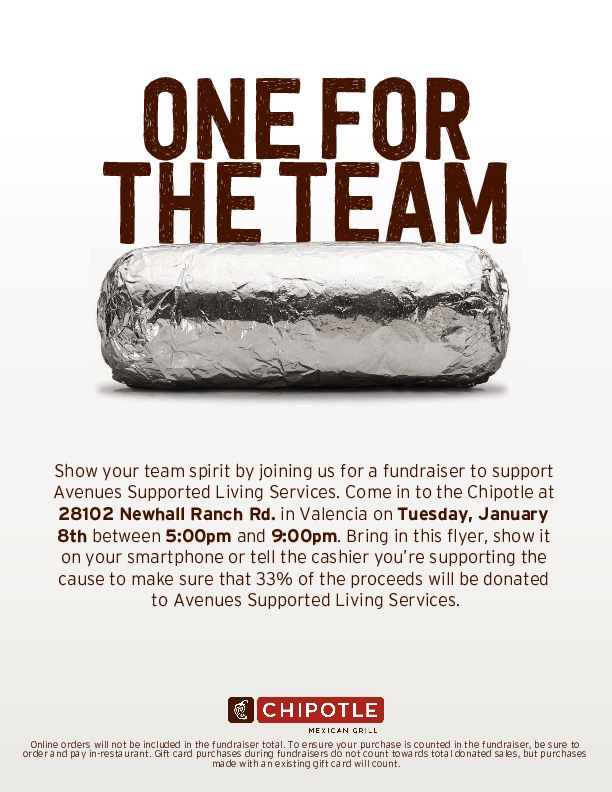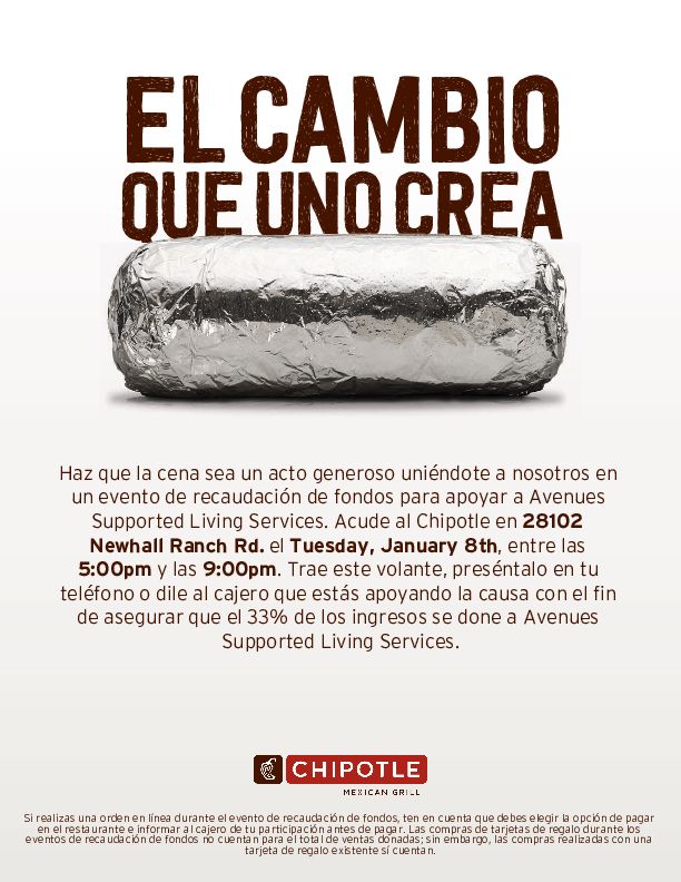 support Avenues Supported Living Services. Come in to the Chipotle at 28102 Newhall Ranch Rd. in Valencia on Tuesday, January 8th between 5:00pm and 9:00pm. Print this flyer, take a pict and show it on your smartphone or tell the cashier you’re supporting AVENUES SLS to make sure that 33% of the proceeds will be donated to Avenues Supported Living Services.