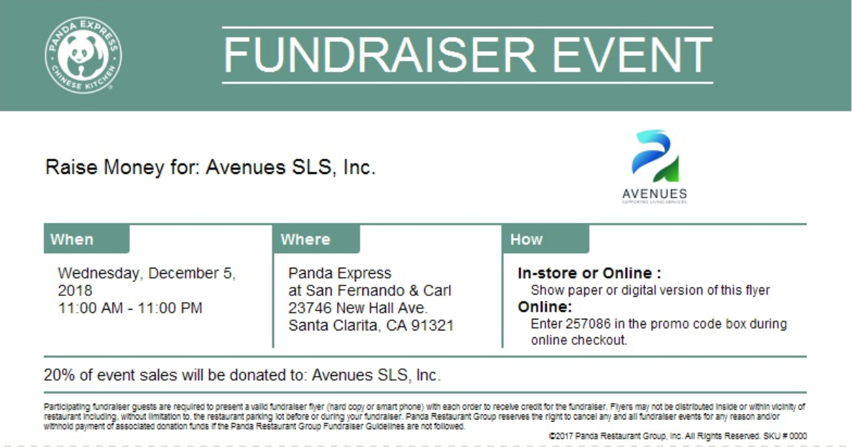 « All Events This event has passed. Panda Express – Newhall Restaurant Fundraiser December 5, 2018 « Panda Express – Valencia Restaurant Fundraiser Panda Express – Northridge Restaurant Fundraiser (at CSUN) » Help raise money for Avenues Supported Living Services by presenting the attached flyer in print or as a photo on your phone. You can also provide the code: 257086 when you purchase food from Panda Express in Newhall on Wednesday December 5, 2018 Add to calendar Google Calendar iCalendar Outlook 365 Outlook Live Details Date: December 5, 2018 Event Tags:fundraiser Website: https://www.facebook.com/events/448459082227534/ Organizer Avenues SLS, Inc. Phone 661.702.9788 Email info@AvenuesSLS.org View Organizer Website Venue Panda Express 23746 Newhall Avenue Newhall, CA 91355 United States + Google Map Phone 6612881060 View Venue Website