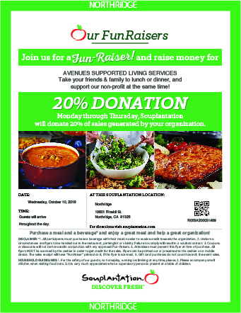 Dine at Souplantation- Northridge – Wednesday, October 10, 2018 – 11:00am – 9:00pm. A flyer is available for download here and on Avenues Supported Living Services Facebook Page. Present the flyer and purchase a drink with your meal for Avenues SLS to receive a portion of the proceeds. See you there! Souplantation is a Buffet chain serving health-conscious American eats with from-scratch soups, salads, pastas & more.