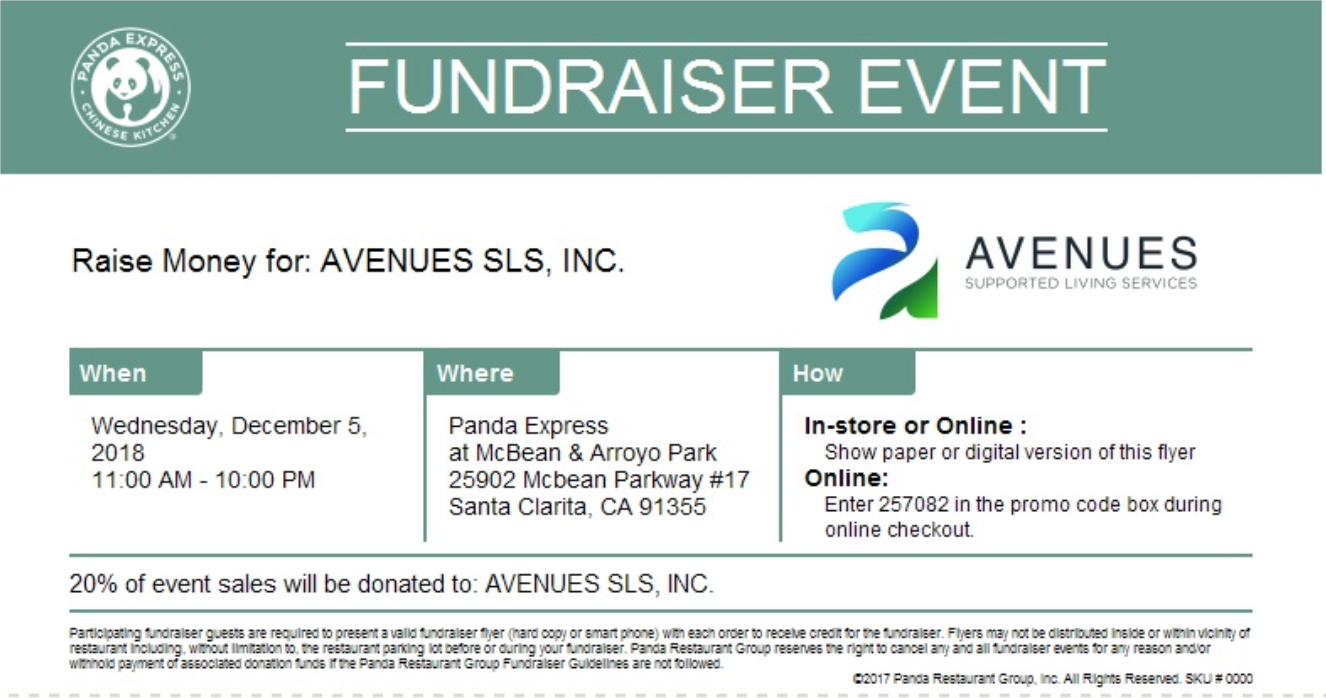 « All Events This event has passed. Panda Express – Valencia Restaurant Fundraiser December 5, 2018 « Community Pints Night for #GivingTuesday Panda Express – Newhall Restaurant Fundraiser » Help raise money for Avenues Supported Living Services by presenting the attached flyer in print or as a photo on your phone. You can also provide the code: 257082 when you purchase food from Panda Express on Wednesday December 5, 2018 Add to calendar Google Calendar iCalendar Outlook 365 Outlook Live Details Date: December 5, 2018 Event Tags:Avenues, fundraiser, Panda Express Organizer Avenues SLS, Inc. Phone: 661.702.9788 Email: info@AvenuesSLS.org View Organizer Website Venue Panda Express Valencia 25902 McBean Parkway Valencia, CA 91355 United States + Google Map Phone: 661-288-1507 View Venue Website